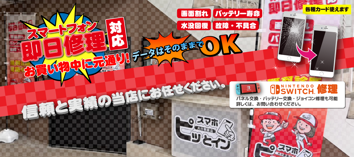 大分駅前でスマホ修理をお探しならスマホピッとイン大分駅前店へ。 iPhone・Android・iPad・Switchの画面割れ、液晶不良、バッテリー交換、水没修理など即日対応可能です。 大分でスマホ修理店をお探しの方はお気軽にご相談ください。
